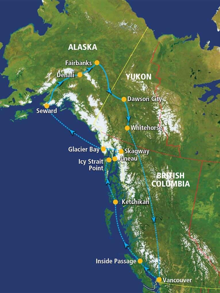 Beknopte route Gletsjers, Gold Rush Yukon & Alaska: Vancouver – Ketchikan – Juneau – Skagway – Seward – Denali – Fairbanks – Dawson City – Whitehorse – Vancouver